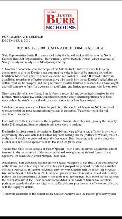 Back in January, when new Republican House Speaker Tim Moore was taking the reins of his side of the General Assembly, he demoted Rep. Justin Burr (R-Albemarle) from the powerful Appropriations Committee. We're sure there's more to the story, but now Rep. Burr has slapped back at his boss in the most public way ... right smack in his "filing statement" for reelection.
